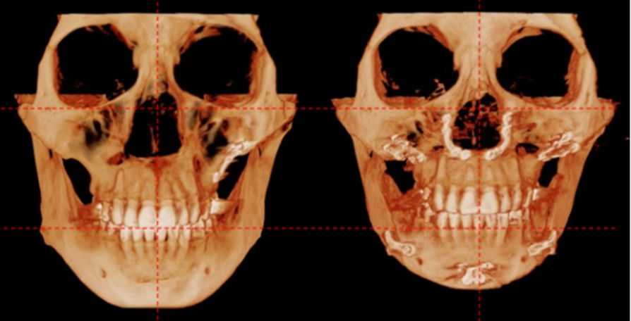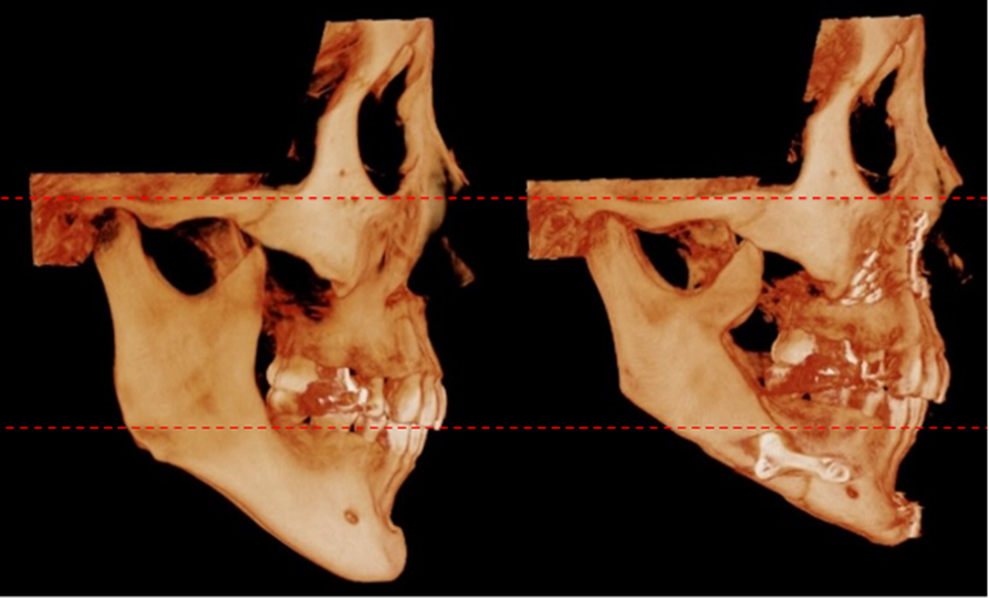상악 수술을 통해 6mm, 하악 윤곽수술로 3mm 길이 축소했고, 중안모 볼륨을 회복하고자 상악과 하악을 2mm 전진하였습니다.