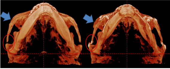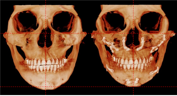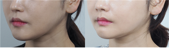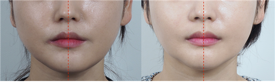 아마도 하악 우측의 아랫부분과 좌측이 측면을 줄이는 방식으로 윤곽수술이 시행됐으리라 생각이 됩니다.